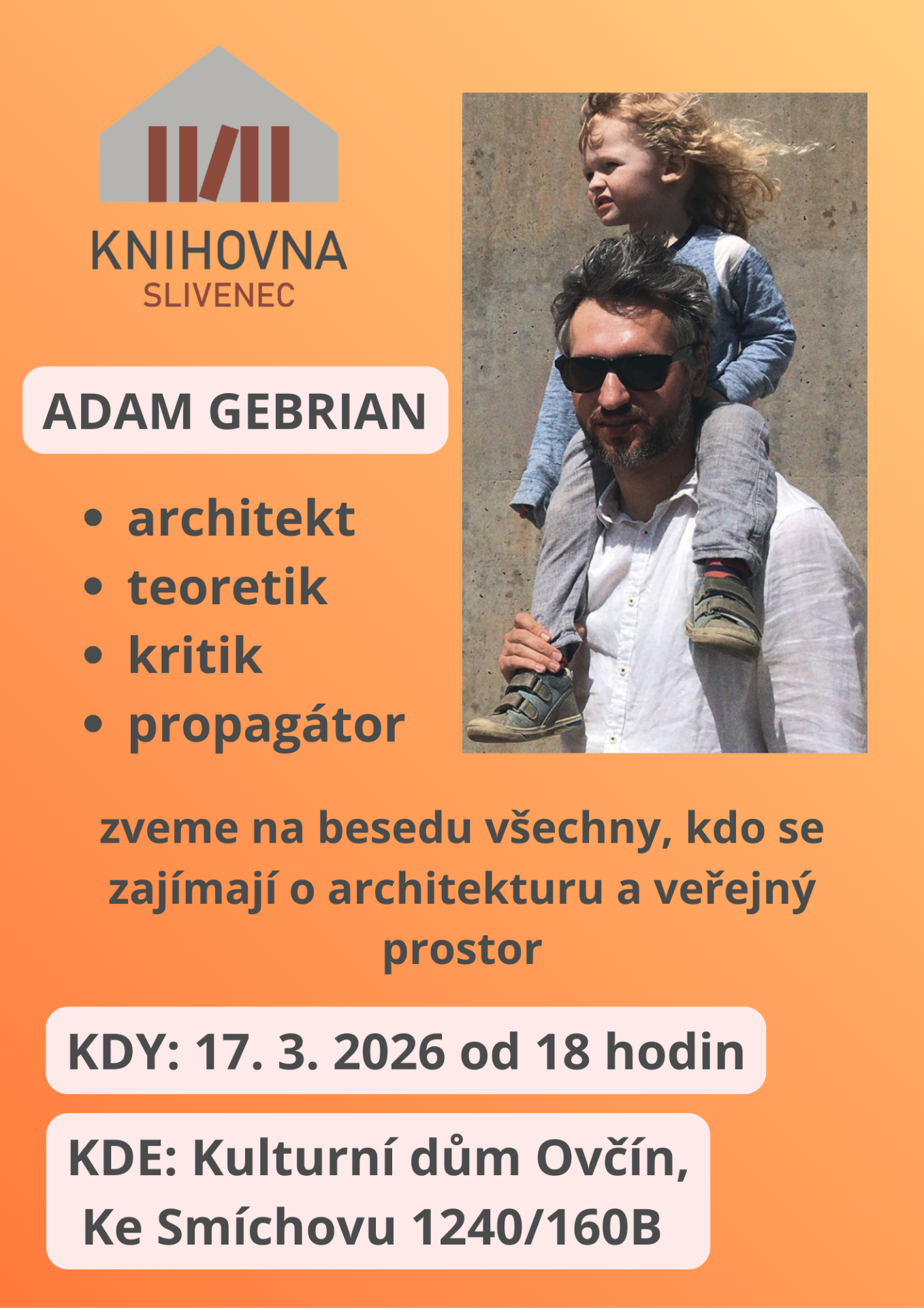 Zveme vás na diskusi se známým architektem, popularizátorem architektury a též spisovatelem Adamem Gebrianem. Rád diskutuje s každým, kdo se zajímá o veřejný prostor, místo, kde žijeme.